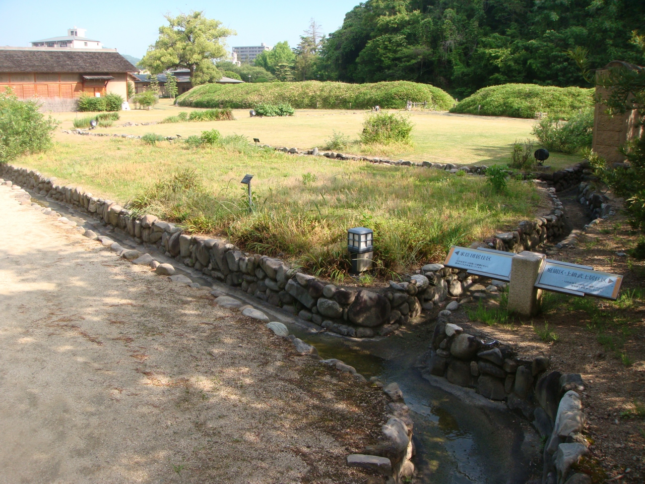 外周は湯築城の外堀で囲まれ、丘陵部を取り巻くように内堀が巡っています。