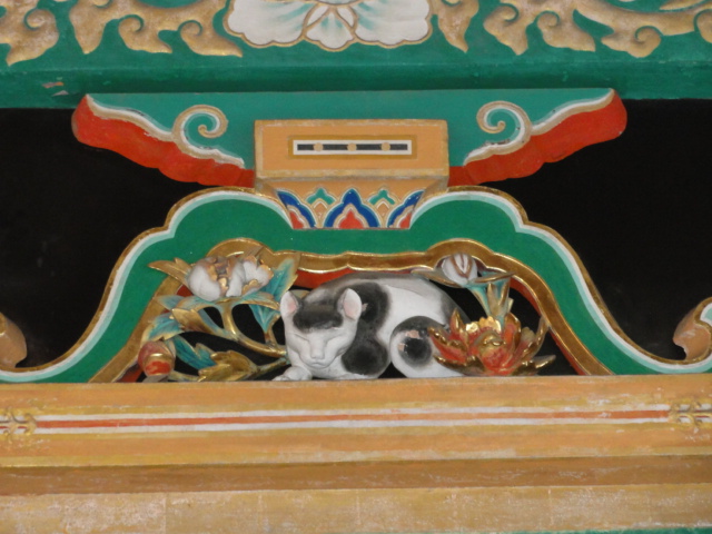眠猫はこちらみたいに案内があり見に行きました。門の上にある眠猫だけ見てさっさと帰るには、別料金が勿体ないと思い、頑張って奥社にも行って来ました。三猿達は色褪せてましたが、眠猫は以前、見た時より修復されて色鮮やかな感じがしました。それにしても、気持ち良さそうに目をつぶってました。