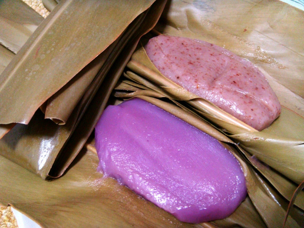 ムーチーとは餅粉に水を加えて練り、平たく長方形にして、サンニン(月桃)の葉に包んで蒸したもの。