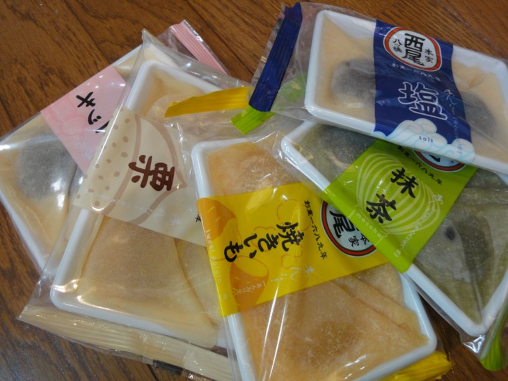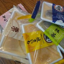 定番の味から季節限定の味まで、たくさんの種類の八ツ橋と、八ツ橋を使ったお菓子を取り扱っています。うれしいのはそれらが全て試食できること!!さらに気前のいいことにお茶まで出してくれます。八ツ橋の有名店はいくつかありますが、西尾さんは全種類5個入りの小分けパックで売っているので、あれもこれも買いたいときや、バラまきにも丁度いいので好きです。