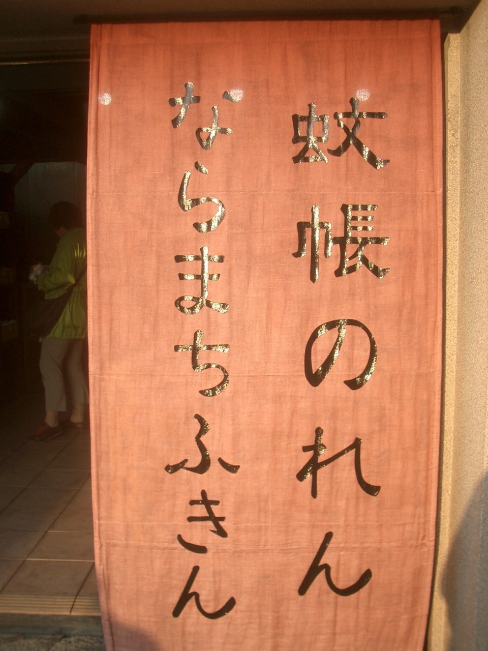 布巾をお金を出して買う、なんて母に言ったらおこられてしましそう。でも、そんな時代なのです。「ならまちふきん」を知っている人に、「買ってきて」と頼まれると、自分の分まで買わずにはいられません。そんなすばらしい布巾なのです。ところで「蚊帳」といってなんだかイメージできますか。むかし、蚊帳の中は暑かった。蚊帳への出入りでは母に起こられたものです。ああ、過去になりました。