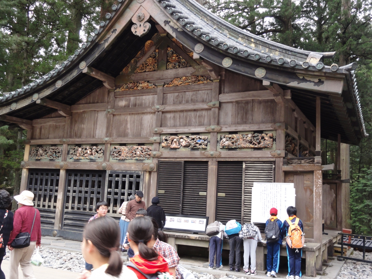 有名な三猿の他、猿の彫り物がある素朴な建物です。郊外学習の小学生が猿の説明を書き留めてました。何の建物かと覗き込んだら馬小屋でした。一日に何時間か実際に馬がここに来るようなことが書いてありました。