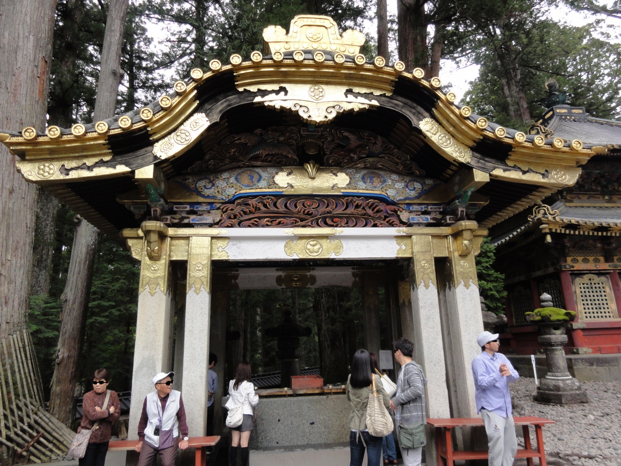 表門から入り、三神庫、厩舎を過ぎたところに御水舎があります。神様にお参りする前に手を洗い、口をすすぎ、心身を清める為の建物ですが、これほど立派なものは他に見られないと思います。白い柱や屋根も金で装飾されていて、徳川家の力がここでも誇示されてる感じがしました。大きな石の水盤は、400年前に九州佐賀藩主から奉納されたものだそうです。良いものを大切に使えば長持ちするのですね。