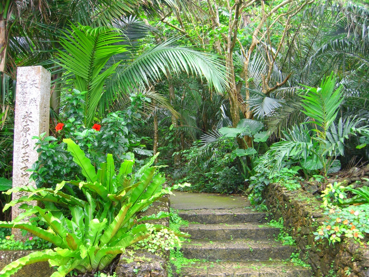 川平湾から車で15分ぐらいで県道79号線から山のほうに3分ぐらい行ったところに15台ぐらい止めれる駐車場がありトイレ、売店・土産店があります。入口に石碑が建っていて、遊歩道が整備されていれ、ジャングルのような亜熱帯の雰囲気が感じられます。ヤシは高く見上げて見ることになります。