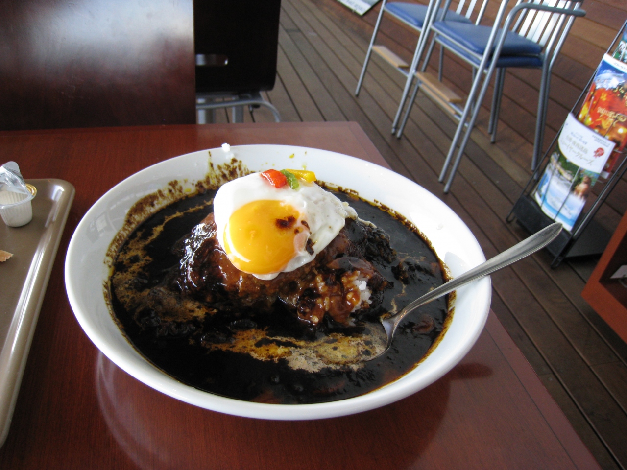 平日にランチに行きました。セルフのカフェです。席数も多いのでわりとゆっくりできます。食べたのは黒船ロコカレーです。カレーのルーが黒いのですが味にはこれといって特徴はありませんでした。全面ガラス張りなので、とても景色が良いです。