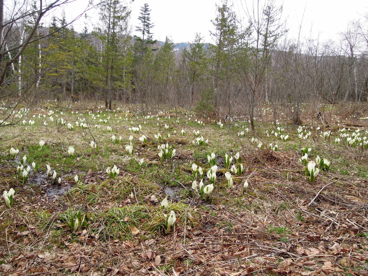水芭蕉の群生地は何箇所かあるようで、最初の場所からさらに奥へ5分ほど行くともっとたくさんありました。