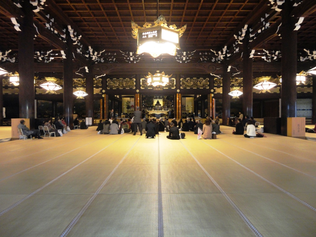 結構、あちこちの寺を歩いているんですが、やっぱり京都は別格です。出掛けてみると、その建物のすごさに圧倒されることがホントに多い。東本願寺もその一つでした。京都駅からタクシーに乗った際、横を通って大きいなあと思っていたんですが、入って間近で見ると、何とでかい。中心の御影堂は間口76メートル、奥行き58メートル。野球場とは言わないけど、体育館といってもおかしくありません。木造建築としては世界最大だそうですが、この大きさを見れば納得です。幕末の蛤御門の変で焼失後、1895年に再建されました。蛤御門の変の被害がこの辺りまで及んだことも驚きだったけど、廃仏毀釈で大きな打撃を受けた日本の仏教があっという間にこんな巨大建築物を再建したのも驚きでした。それにしても、この巨大な大広間、一体、何人の人が入るんだろう。