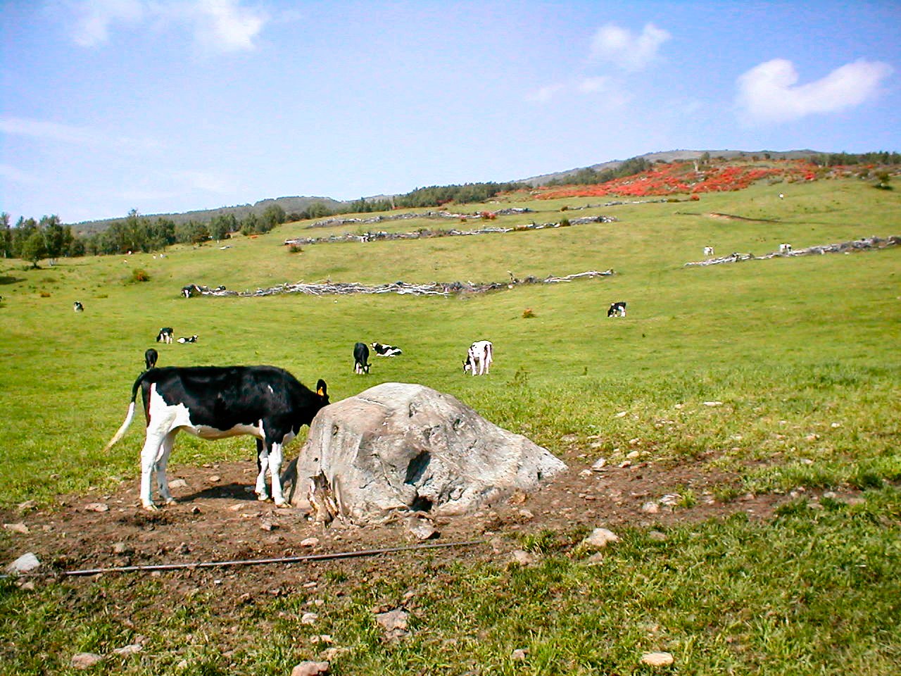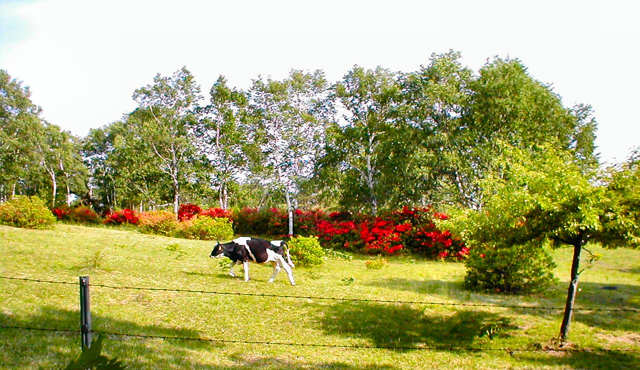 この牧場は,6月頃 レンゲツツジが見頃になります。この頃は,他にも種々の花が咲きます。晴れた日は雄大な根子岳の景色が特に素晴らしいです。牛だけでなく 羊などもいて,子供さんにも人気のようです。