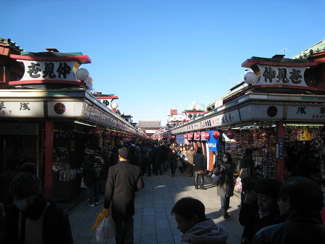 仲見世通りは観光客でいつも賑わっています。出来立ての熱々せんべいが食べられたり、食べ歩きもできます。人形焼のお店はいくつかありますが、いつも「セール中」の表示のあるお店があります。以前この表示につられて人形焼を買いました。