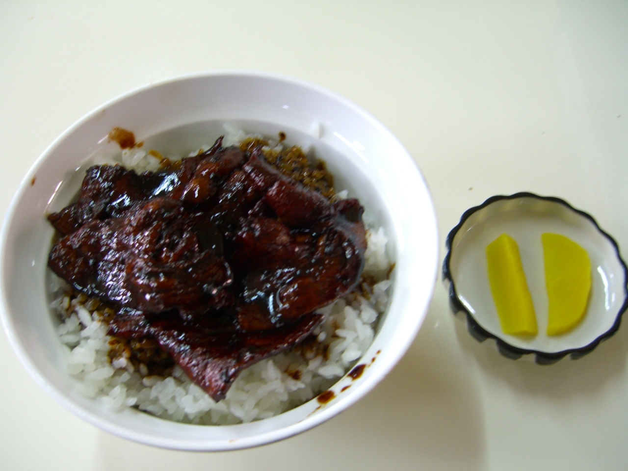 豚丼を注文、たくあんも付いています。タレが黒い豚丼でした。見た目は濃そうな味ですが見た目より濃くはないです。肉は少しかためでした。タレが多くかかっていてタレだけでも御飯が食べれます。豚丼専門店かと思ったら刺身定食、天ぷら定食、天丼等もありました。