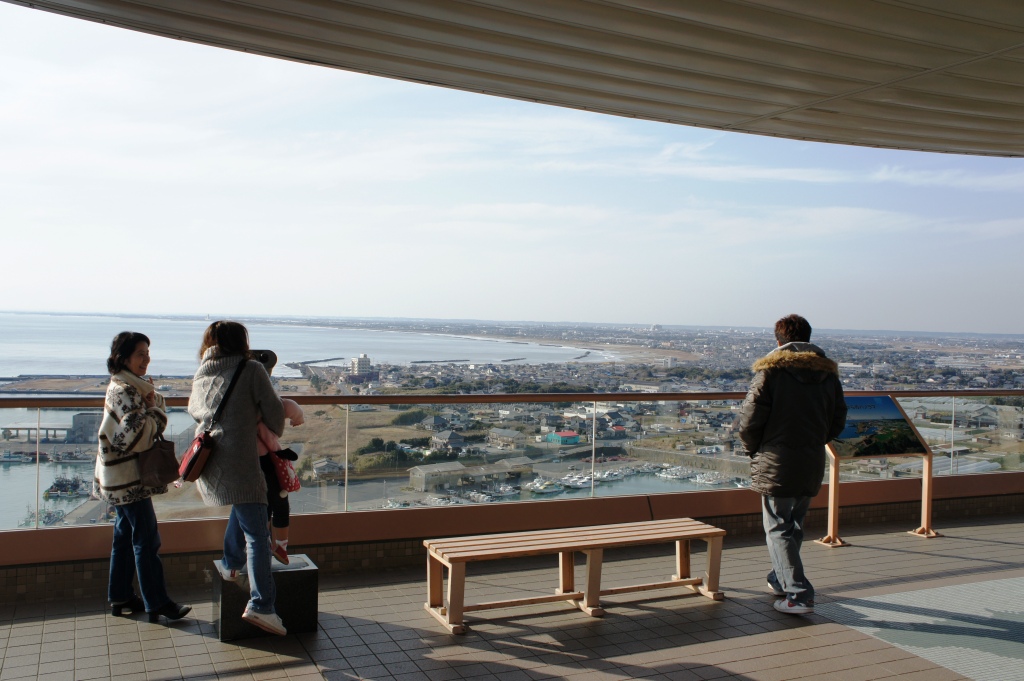 何十キロもビーチが続く千葉県の九十九里浜を北上していくと一転、海岸線は険しい崖となります。その南西端には飯岡刑部岬展望館光と風がありました。車で上っていくと、崖上の台地にモダンな展望台が立っていました。この付近の標高は60メートルほどですが、すぐ前が雄大な太平洋。見えるのが青い海と水平線だけという、都会では決して味わえない眺望が楽しめます。気になるのは東日本大震災の影響。訪れたの震災2カ月前でした。この周辺は津波で大きな被害が出ていますが、何か地形の変化などが起きているのかもしれません。