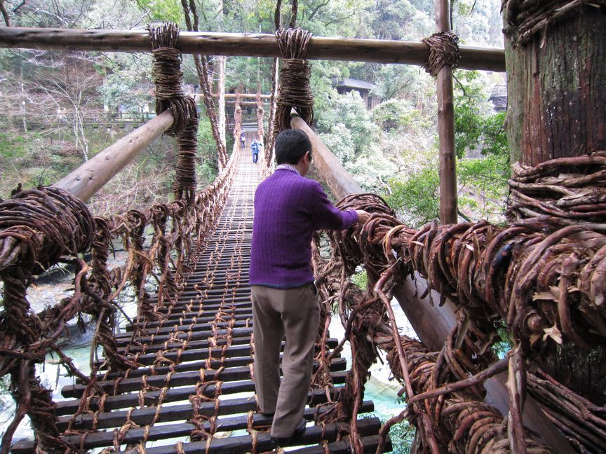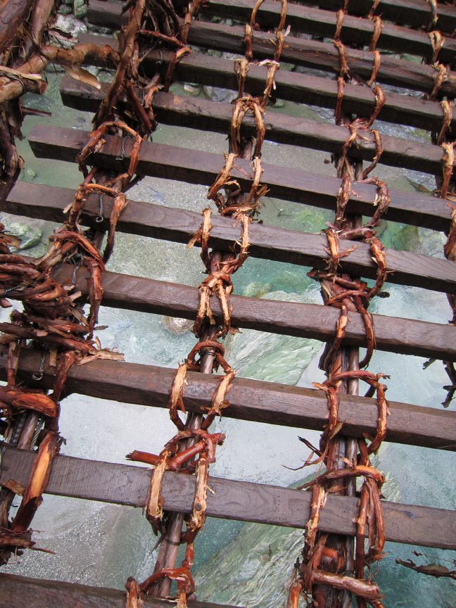 外から見ていると短い橋で大したことないと思っていましたが、実際に橋を歩くと足元から深い川底が見えるので怖くて怖くて…。渡るのに10分くらい掛かってしまいました。旅館の人から「かずら橋1基作るのにかずらが6トンくらい必要で、昔は16基もあったが今では3基しか残っていない。今年は3年に1度の橋の架け替えの年で、親子3代が一緒に橋を渡るという儀式も行った」とのことでした。私たちは新しい橋を渡ることができたようです。
