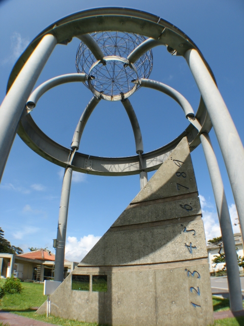 「東経123度45分56789」の場所。それを記念したオブジェ(モニュメント)があり、背後に「ふれあい館」と称する施設が設けられています。