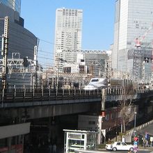 花壇等もある憩いの場のような所があり、有楽町駅方面を見ていると新幹線が通過していきます。東京駅がすぐ近くなのでスピードも弱まっているようでした。