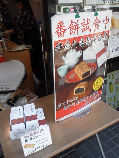 神奈川県の指定銘菓にもなっている番餅(バンピン)が看板商品。丸い月餅をパウンドケーキのような長方形にしたものです。店頭でよく試食を配っているので、買う気満々で行ってもとりあえずもらってからお店に入ります(笑)番餅のほかにも普通の月餅や中国のお菓子(名前が分かりませんが…)、中華まんなどいろいろ揃ってます。