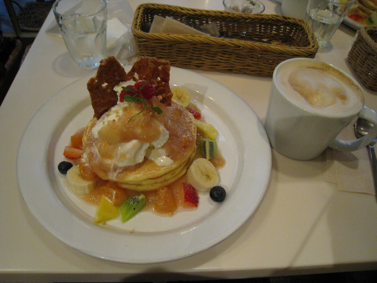 平日の15時すぎに行きました。ビルの3階なので混んでいないだろうと思っていたら、ほぼ満席状態でした。パンケーキは数種類あり、飲み物を一緒に頼むと100円引いてくれます。パンケーキは3段もあり、見た目よりお腹がいっぱいになり夕食が食べられませんででした。二人で分けたほうがいいかもしれません。