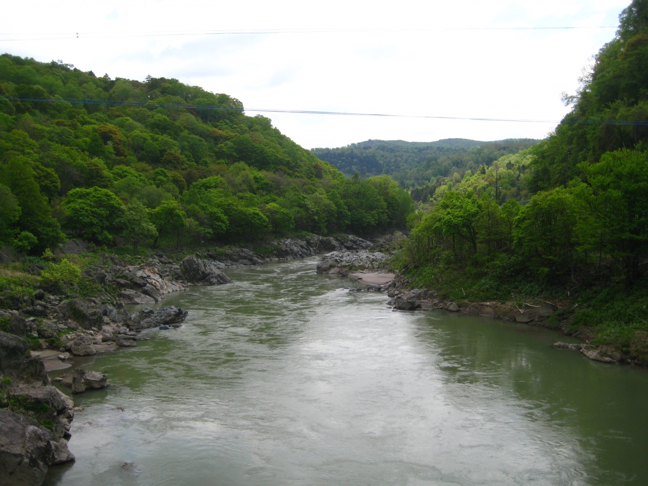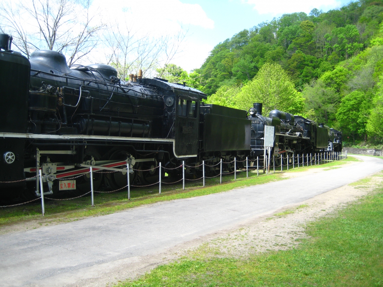 神居古潭は、旭川市がある上川盆地で、幾多の支流から水を集めた石狩川が石狩平野へと流れ出る場所にあり、川の流れは細く急流となっています。川の最深部は水深70mにも達すると掲示されていました。明治34年に設置された旧神居古潭駅の駅舎が保存されており、3台のSLが保存展示されていました。その中の一台はC57型として最後に製造されたものだそうです。鉄道ファンにとっては一見の価値があるかもしれません、