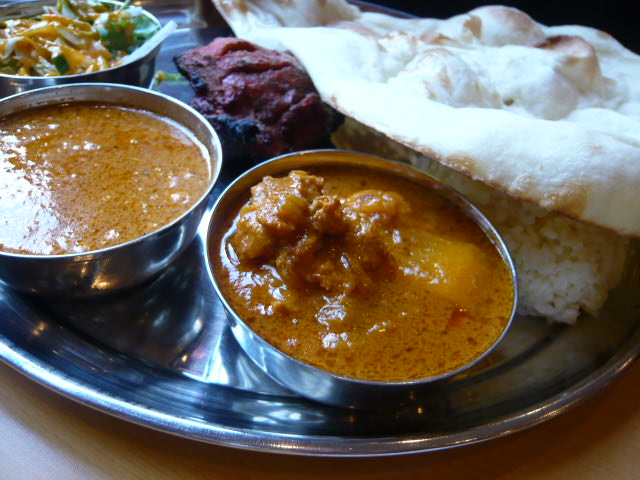 ランチは3種類。全て、サラダとラッシー付き。Aランチはカレー1種+ナンorライス、Bランチはカレー2種+ナン+ライス、CランチはBランチにタンドリーチキンが付いたもの。カレーは5種類ほど用意されていたので、二人でカレー2種類づつ選んでも被ることはありません。