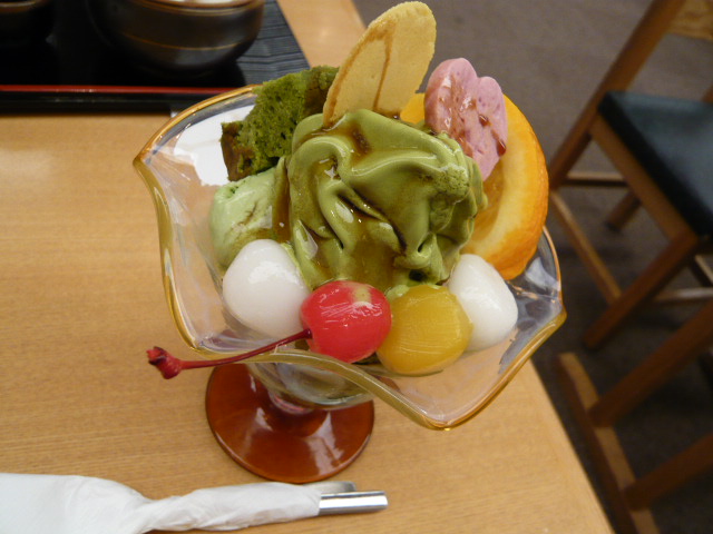 舟和の抹茶パフェを注文したら、ボリュームたっぷりで、ソフトクリームの中からは、栗の甘露煮や甘いつぶあん、そして芋ようかんも出てきて、テンションあがりました。