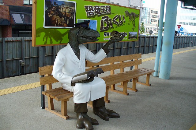 福井県の中心となる駅です。JR北陸本線からえちぜん鉄道に乗り換えることができます。えちぜん鉄道は福井駅から三国港と永平寺、越前大野方面に向かうローカル私鉄です。駅舎はJR駅から高架線の下を少々歩きます。ホームのベンチにはなぜか恐竜が座っており、かなり不気味です。