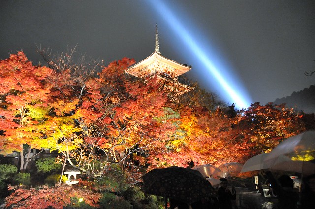 毎年紅葉シーズンは昼間だけでなく夜も一般に開放され、清水の舞台が美しくライトアップされます。舞台から眺める京都の夜景とライトアップされた燃え盛るような紅葉。まるでこの世のものとは思えない美しさです。