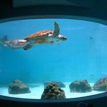 ウミガメは地上からも見られますが、地下へ行くと、ウミガメの泳いでいる姿が見られます。水槽に自然光が入ってきていたということもあり神秘的でした。