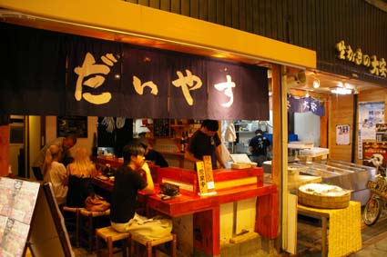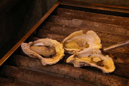 錦市場の端っこ(烏丸通のほうへ向かって)にある牡蠣のお店。錦市場にはアーケードなのでオープンエアというのが正しいのかどうかわかりませんが、開放的な雰囲気で貝類などが食せます。焼き牡蠣は1こ200円。ビール400円。昼間っからたくさんののん兵衛たちがゴキゲンにたむろってます。