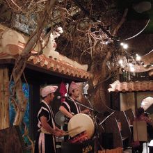民謡を演奏していた人が、休憩中にテーブルを回って沖縄についての質問などに答えていました。