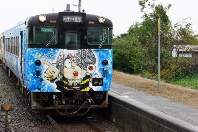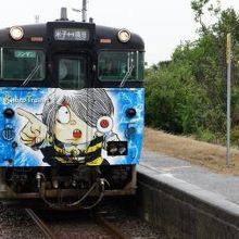 米子駅から境港駅までの各駅には、それぞれ「ゲゲゲの鬼太郎」に登場するキャラの名前が付いているのですが、駅だけでなく、「鬼太郎列車」、「ねずみ男列車」、「めだまの親父列車」、「ねこ娘列車」というキャラ電も走っています!外観だけでなく、内装も凝っているので、皆大興奮!子供たちより、ゲゲゲ世代の大人の方がテンションが高めです!