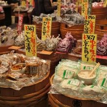 お店の前に並んだ樽が印象的なお店。ずらりと並んだ樽の中には、おいしそうなお漬物がディスプレイされています!まず、その種類の多さにびっくり!試食も可なので、自分のお気に入りを見つけることができます。京都らしいお漬物も多く並んでいるので、お土産にもピッタリです。