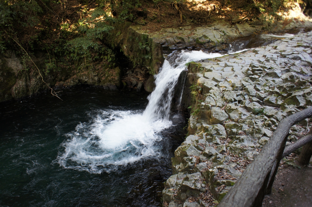 河津七滝は、「かわづななだる」と読みます。この辺りでは、滝を「たる」と読むのだそうですが、河津川の約1.5kmの間には、点々と7つの滝が存在し、その総称です。それぞれに名前が付いていまして、上流から、釜滝(かまだる)、えび滝(えびだる)、蛇滝(へびだる)、初景滝(しょけいだる)、かに滝(かにだる)、出合滝(であいだる)、大滝(おおだる)です。修善寺の方からバスで訪ねたのですが、運転手さんに言ったら、上手の方から回れるバス停を教えてもらいました。いきなりの急勾配で目がくらみそうでしたが、やはりこの方が回りやすい。「踊り子と私」のブロンズ像がある初景滝まで出た所で、息をつきました。なお、出合滝と大滝の入り口は離れた別の場所になっています。