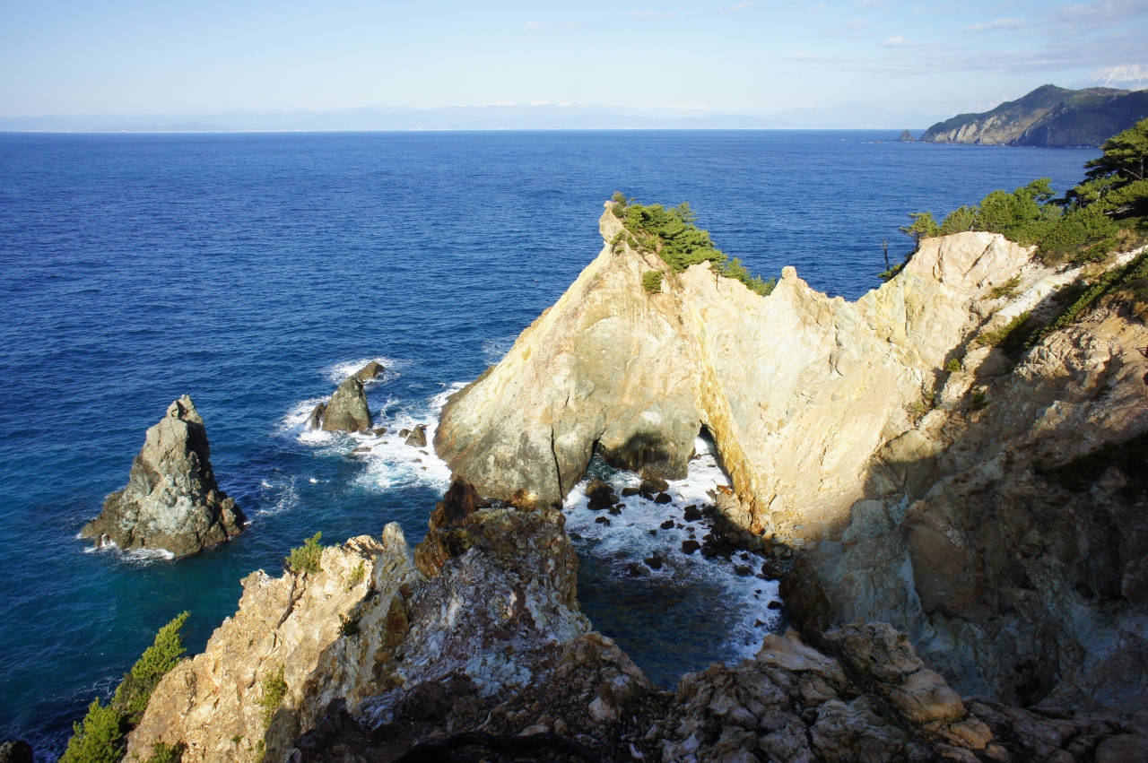 黄金崎公園は、黄金崎クリスタルパークから歩いて。普通に車が通るトンネルを抜けていくので、観光地としてはちょっといただけないなあと思ったのですが、トンネルを抜けると、海を見下ろす道になって、だんだんと雰囲気が出てきます。行き止まりに駐車場があって、そこからは、岩場に沿った遊歩道が伸びていまして。波が打ち寄せる海岸線、沖に突き出た岩の小島など、日があたって、黄金崎という名にふさわしい美しい景色が広がります。先端の富士山を望める展望台もありますが、こちらはちょっと遠目で、迫力はイマイチでした。