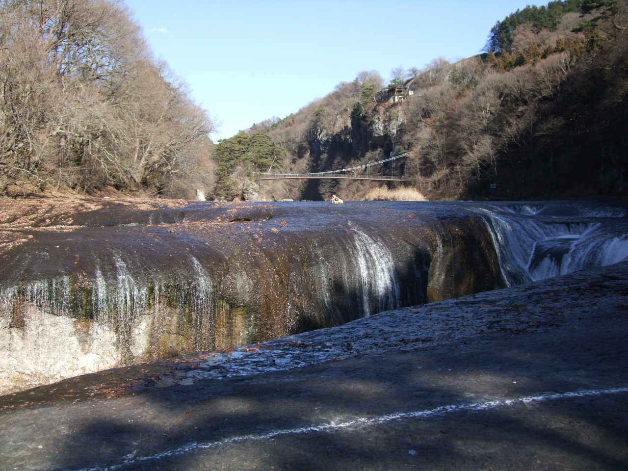 吹割の滝は、JR沼田駅から路線バスで。ただ、1時間以上かかりますし、片道1300円ほど。それほどのことをしていく価値があるかどうかは微妙ですが、以前、尾瀬に行った帰りに気が付いて、それから気になっていたので、改めて訪ねた次第。バス停からは歩いてすぐ。高さ7メートル、幅30メートルという滝は、岩の河床が大きく窪んだところにできています。窪み方は、砂に強く息を吹きかけた時にできるような形に見えましたが、名前は関係するかどうかわかりません。天然記念物でもあり、名勝にも指定されているということですが、見おろして鑑賞する滝なので、その意味では、迫力はイマイチかも。