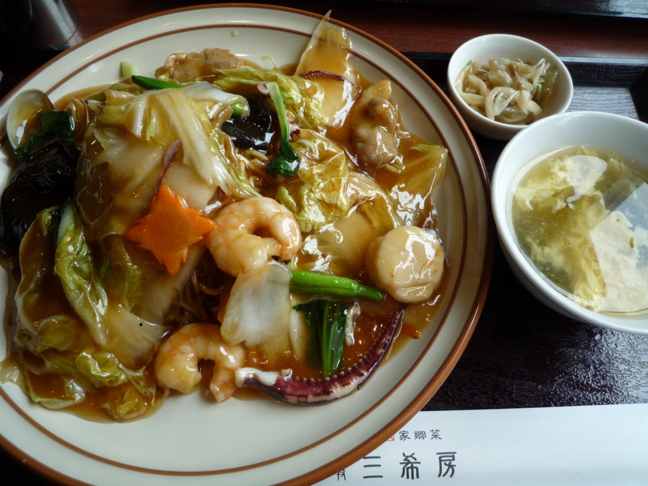 海鮮あんかけ焼きそばは予想通りの味ですが、大きめの海老やホタテも入って満足でした。