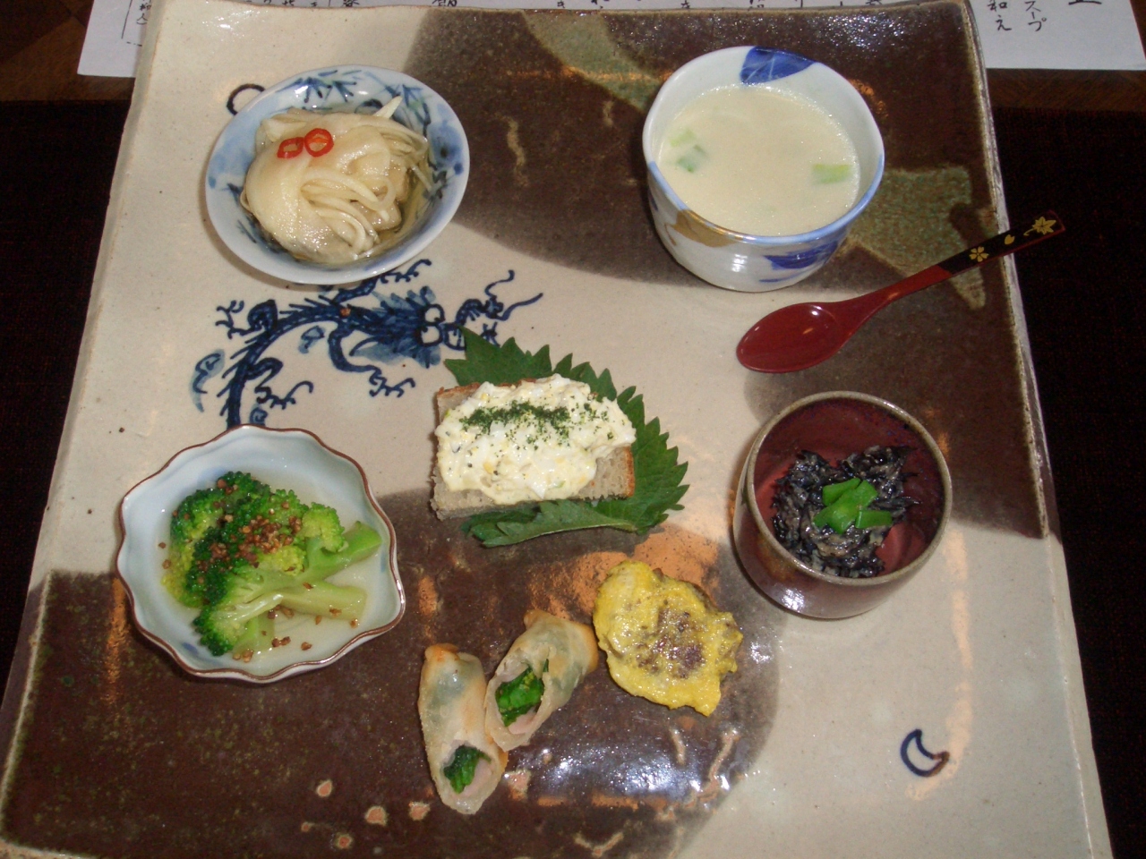 洋間はシックなテーブルで次々と運ばれる蕎麦を使った料理と器に見とれました。