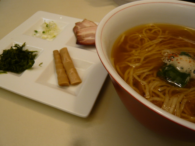 サイフォンでダシを抽出するのがウリのようで、お店のカウンター奥にはサイフォンが見えました。ラーメンのトッピングはメニューの中から3品選べるシステム。運ばれてきたときには、ラーメンとは別にトッピングだけイタリアンの前菜盛り合わせのような感じで出てきて驚きました。