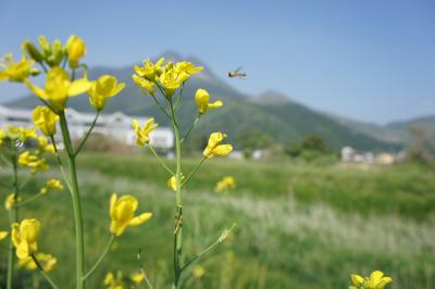 湯布院のメイン観光スポット「湯の坪街道」のえらい混雑っぷりにげんなりしましたが、大分川の川沿いは、風情があって静かでオススメです♪堤防には、菜の花が咲き、菜の花越しに由布岳を望むことができます。サクラの時期には堤防沿いにサクラの花と菜の花がが満開になり、それは見事な眺めだとか...。菜の花のタネは、毎年青年部と青年部OBによって蒔かれているそう...。