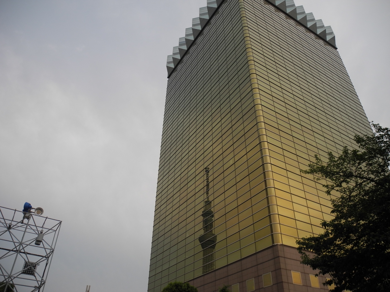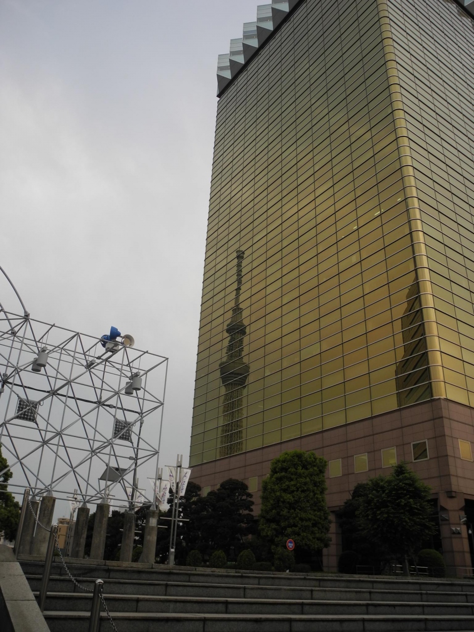 東京スカイツリー (とうきょうすかいつりー)は、大人気ですが、浅草から東京スカイツリーに行く際に、いろいろな場所から東京スカイツリーの見え方がしてますが、その中の一つ、こんな場所、建物のガラスに映った東京スカイツリーもあります。