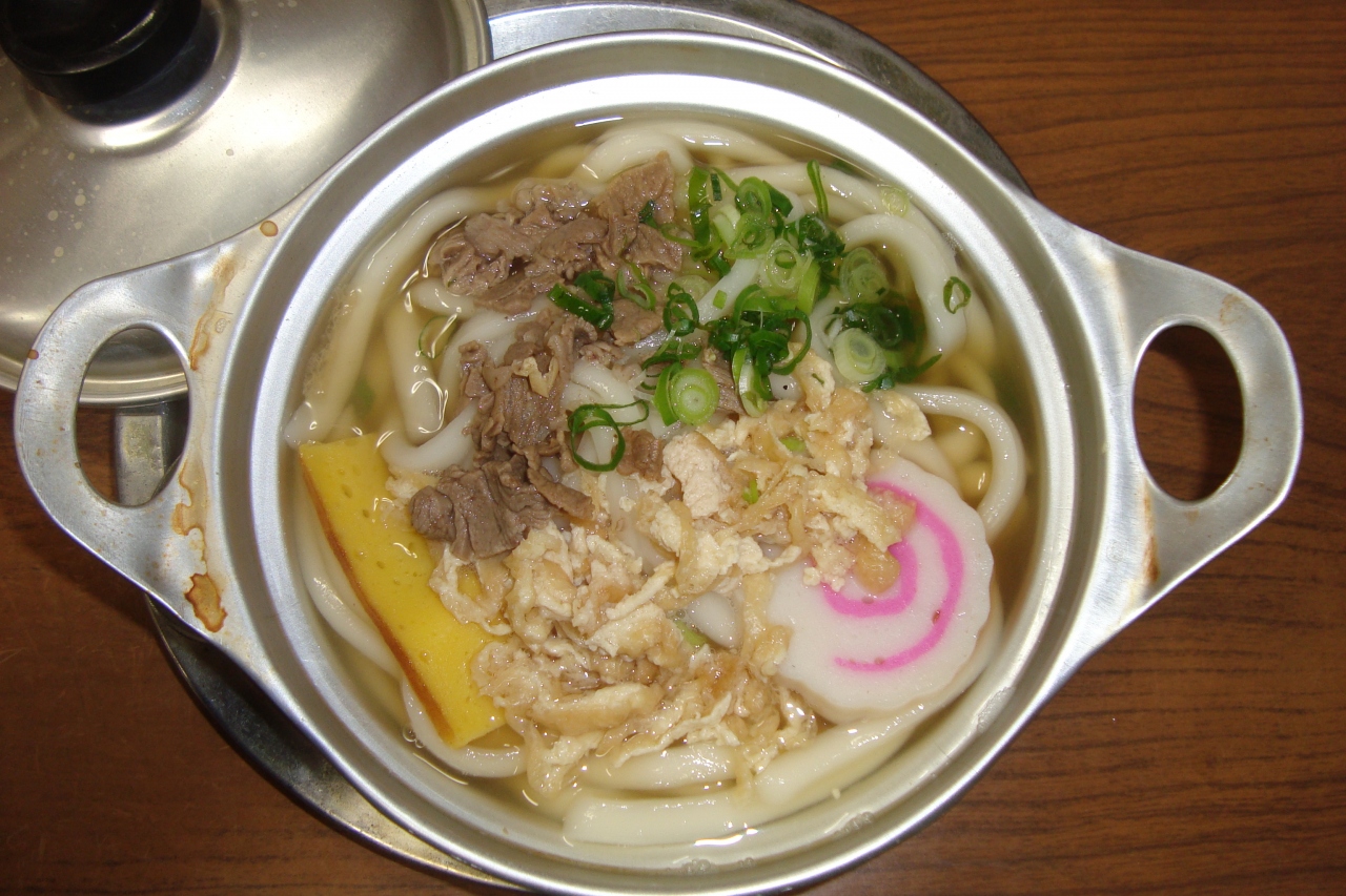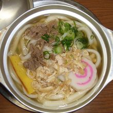松山名物の「鍋焼きうどん」を食べることができます。うどんはコシがなく、柔らかいものですが、とても美味しいです。出汁は甘めの味付けで油揚げとの相性が良いです。トッピングされている牛肉も甘めの味付けで美味しいです。別売りのいなり寿司も甘くて美味しいです。