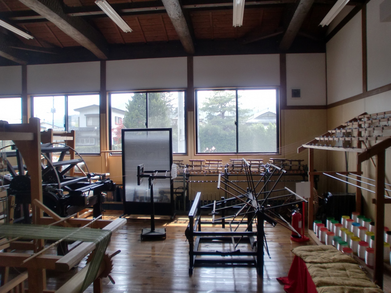 館内は入場無料でとても新しい建物ですが、和の雰囲気があふれていて展示館にはぴったりの風情です。中に入ると作品などが展示されていて、実際にいろいろな作品を購入することが出来ます。奥の方には織機などがあります。体験教室などもあるようです。こちらには美顔パフといって繭から紡いだ糸で作られたものがあります。100%シルクのマッサージ用パフです。