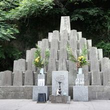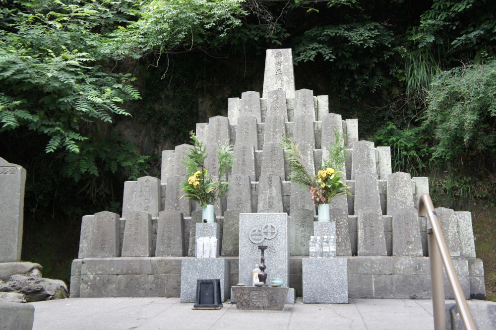 鶴丸城の北側にある墓碑が「薩摩義士碑」。江戸時代に、幕府から木曽川などの改修工事を命じられ、薩摩藩は多くの人員と莫大な工費を費やしなんとか完成させましたが、完成に至るまでの間、80名余りの犠牲者を出したとか...。その方達の供養墓塔として、大正9年(1920年)に建立されたのが、この碑です。将棋の駒を並べたような碑ですが、頂上には、出費の責任をとって自刀した治水総奉行家老平田靱負の名前があります。歴史の教科書などには出てこない出来事ですが、かなしい歴史の一部分を見た気がしました。