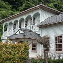 旧芹ヶ野島津家金山鉱業事業所だった建物を移築したもので、2階にあるアーチ型のテラスや淡いペパーミントグリーンの外壁がなんとも言えずレトロな洋館です。入口の上に、島津家の家紋「丸十」がど~んと飾られています。「現 磯くわはら館」と書かれていますが、実際には2012年4月に移転したため、この名称は正しくありません。中でお茶でもと思っていましたが、閉店中のため、中には入れませんでした。