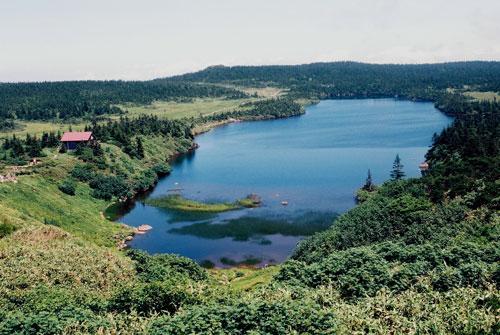 見返峠から左へ進むと、ガマ沼と八幡平のシンボル八幡沼が現れます。