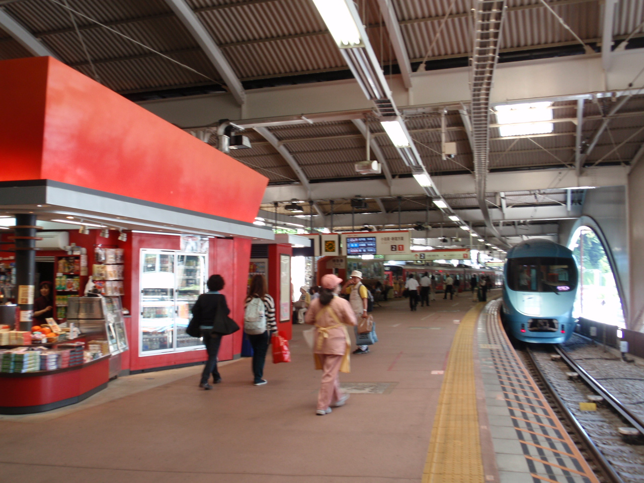 ホームには、赤色の登山電車や水色の電車(ロマンスカー?)が停車していて、素敵な光景でした。