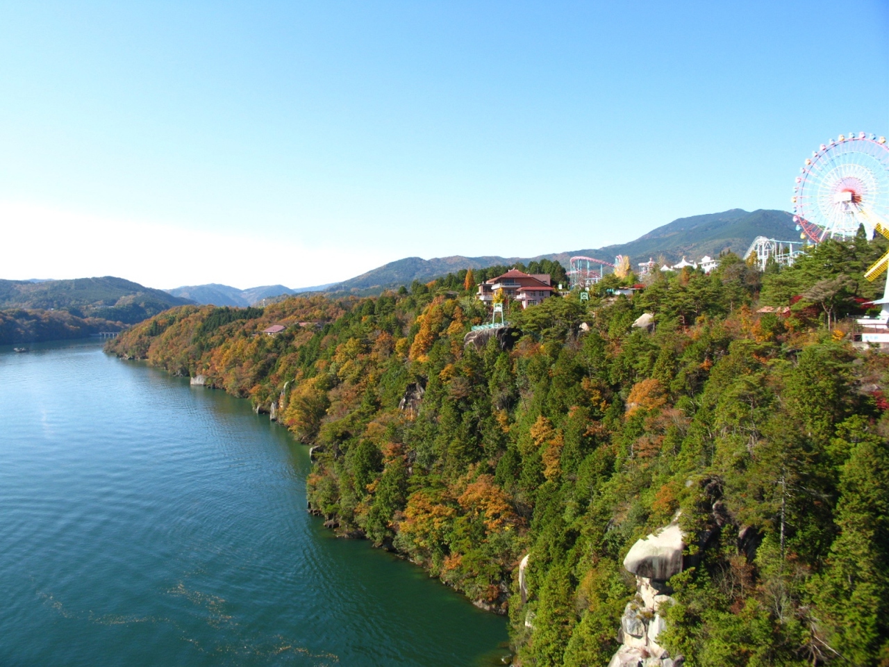 秋の紅葉狩りに出かけて見ました。湖の周りの山々が、秋の彩りに包まれます。恵那峡レンド(遊園地)も、紅葉景色の一部分になっているかのように見えます。湖には、遊覧船も運航されているみたいで、湖面から見る紅葉もいいでしょうね。どこから見ても「絵」になりますので、いろんな場所で紅葉狩りを楽しめますよ!!