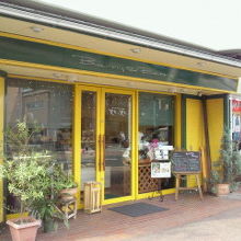 黄色×緑のかわいい外観のスイーツ店です。外からはわかりにくいかもしれませんが、イートインスペースもありますので、お店でゆっくり楽しむこともできます。
