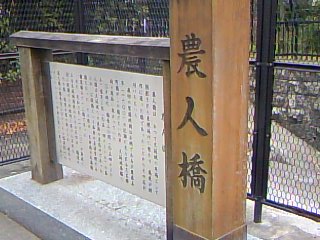 農人橋(のうにんばし)の名前の由来は、橋の端っこにあった顕彰碑によると農民が耕作のために通った橋だったから農人橋って名がついたんだって。