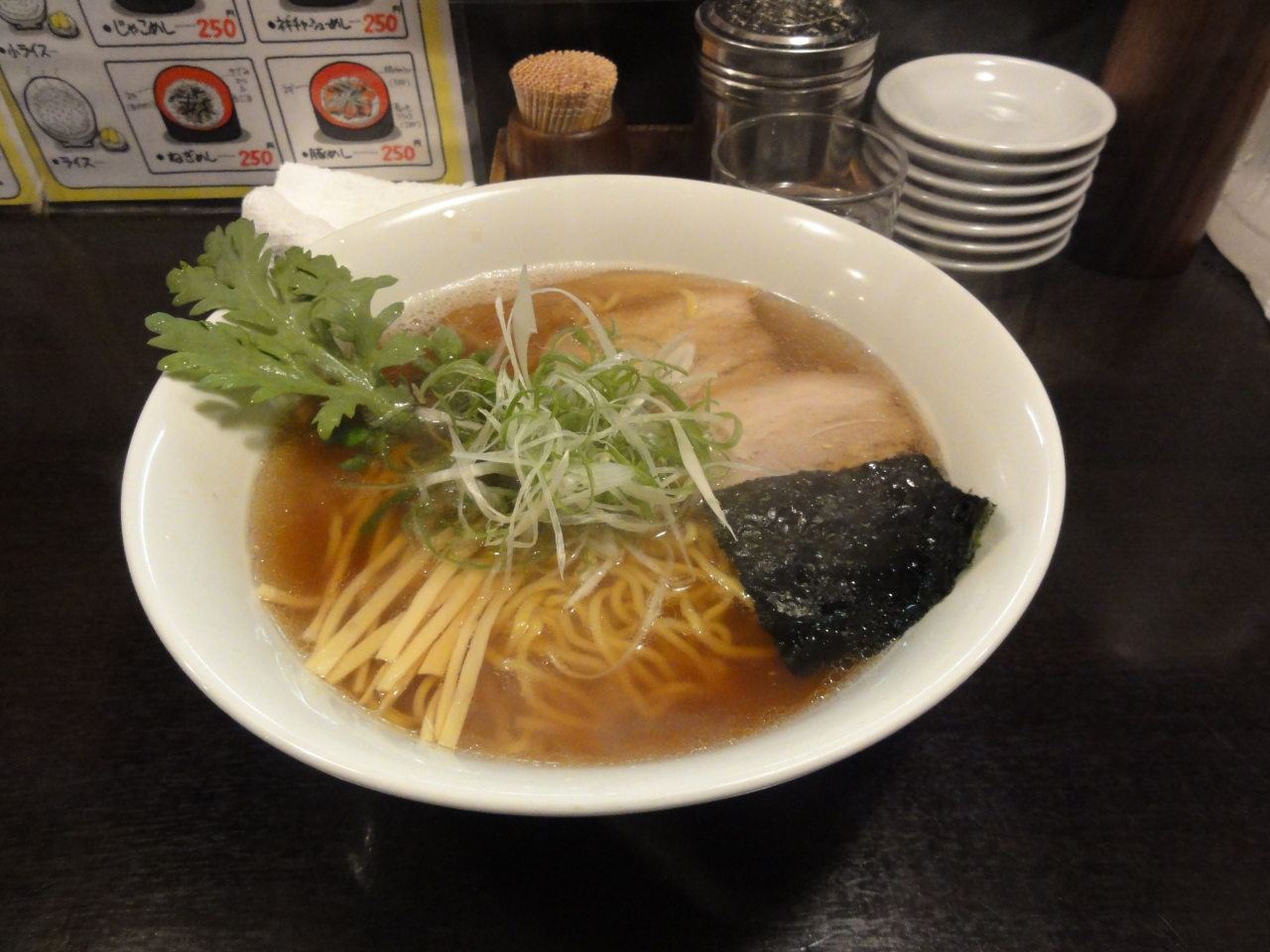 醤油ラーメンを食べましたが、だしは鮭節で採ってるそうでさっぱりした感じでした。トッピングは、細切のメンマ、春菊の葉、葱とチャーシュウでこちらも新鮮でしたが、自分の好みは鶏だしだと食べて再認識しました。
