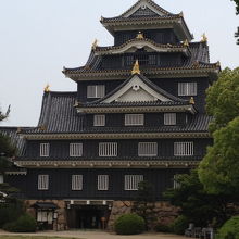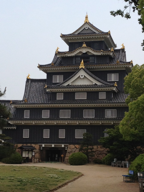 日本100名城制覇を目指してます。岡山城は外壁が黒いので烏城とも言われているそうです。6階建てだし威圧感あります。エレベーターで6階まで行き、資料や眼下を眺めながら降りて行きます。運がいいと籠に乗ったりお姫様に返信した写真が撮れるかも。