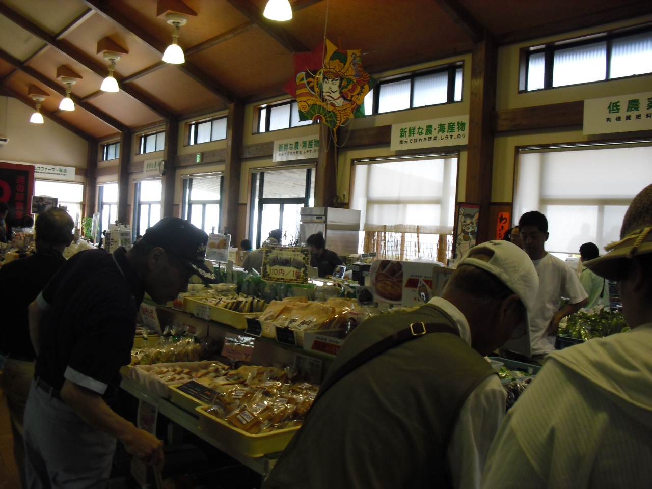駐車場には車がいっぱい、道の駅の中は人でいっぱい、人気のあるところです。店内にはおいしそうなものがいっぱいで、野菜や果物、米、鉢物、練り製品など所狭しと置いてあります。珍しいものとしては、メダカが売っていました。また、屋外には足湯があり、海を見ながらくつろげました。